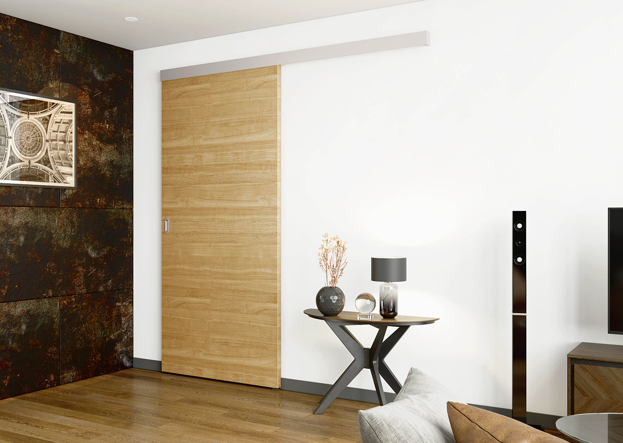 SAF®-Évolution est le système coulissant PREMIUM pour portes d’intérieures de 20 à 265 lbs (10 à 120 kg) aux lignes savamment épurées.